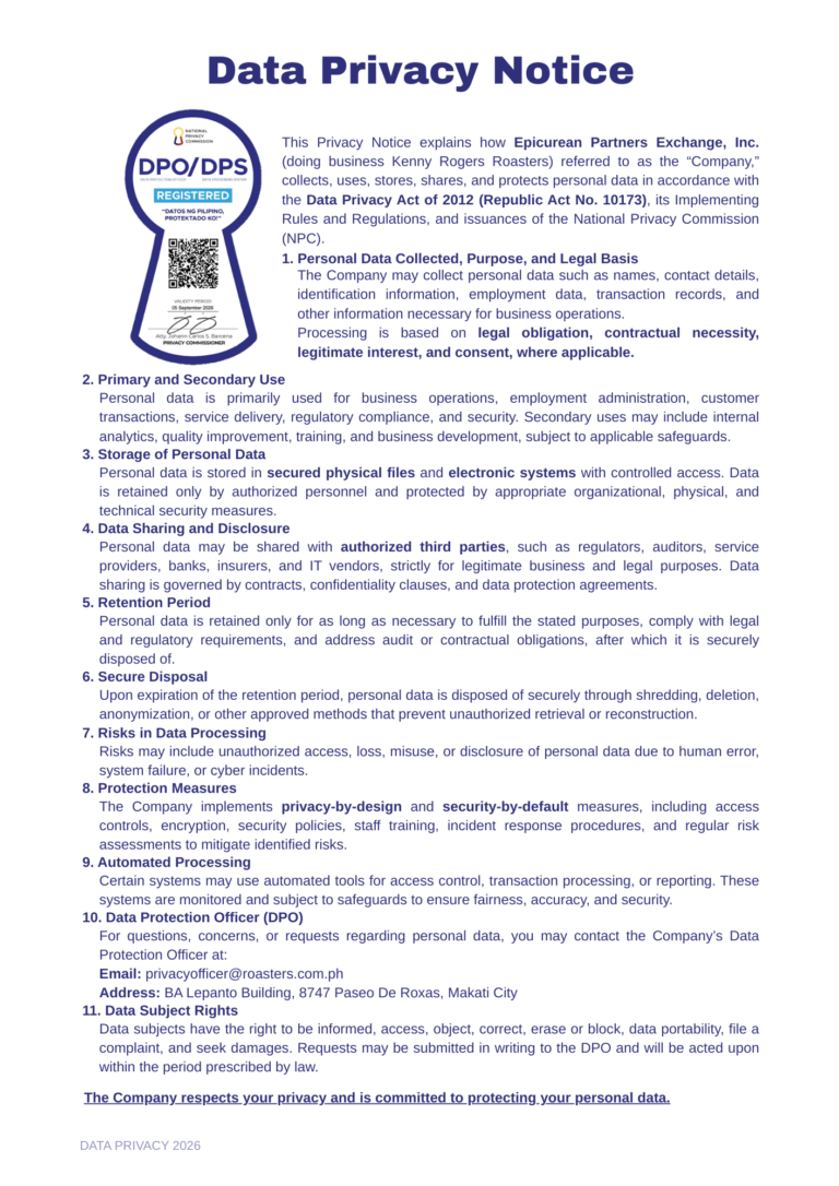 If you have questions regarding this policy, you should contact kennyrogersdelivery.com.ph by email at guestservice@roasters.com.ph